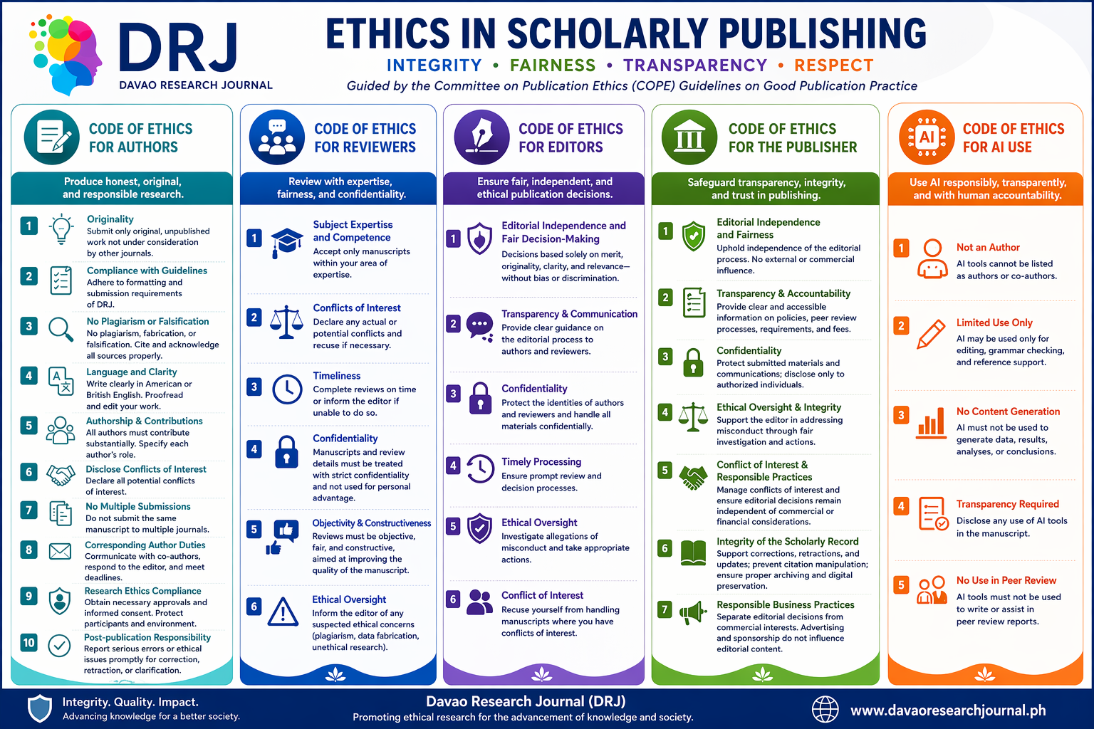 The Davao Research Journal (DRJ) is committed to upholding the highest ethical standards at all stages of the publication process, guided by the principles of fairness, integrity, transparency, and respect for intellectual property. DRJ subscribes to the Committee on Publication Ethics (COPE) Guidelines on Good Publication Practice.